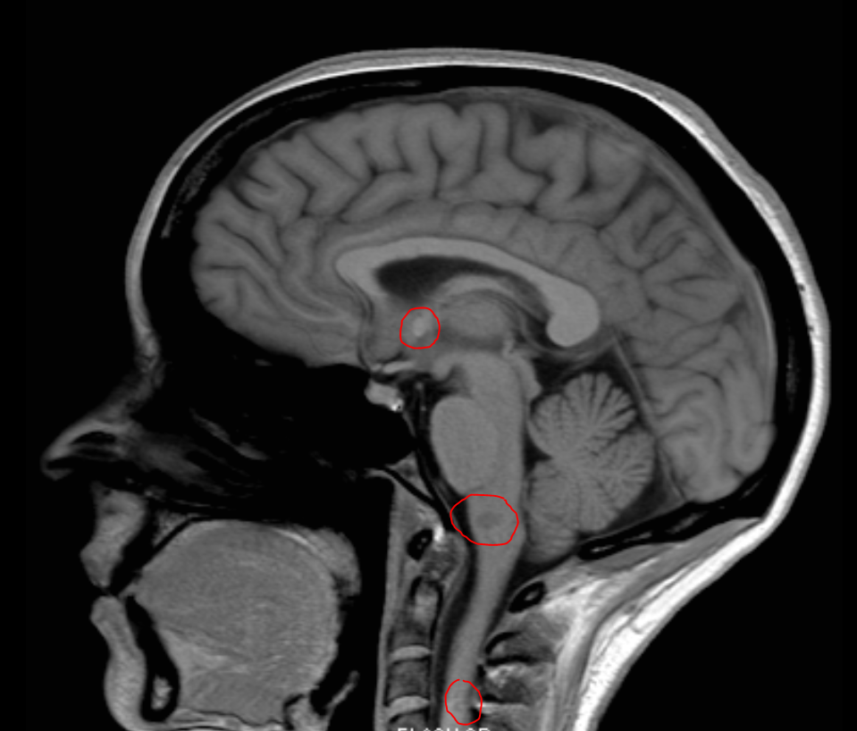 You will notice faint marks (helpfully circled in red). These are lesions or scars caused by my immune system savagely attacking my central nervous system. Arsehole! The fateful diagnosis.. Multiple Sclerosis. What a shocker.. stopped Fun Times right in their tracks. Sucks right.